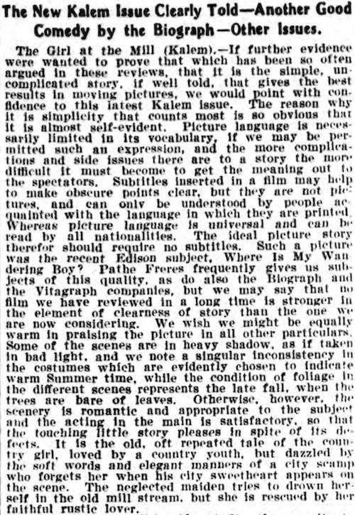 | La presse The Moving Picture World, 23 janvier 1909, p. 93 ![]() The Moving Picture World, 30 janvier 1909, p. 120 ![]() The New York Dramatic Mirror, 30 janvier 1909, p. 9 ![]() |