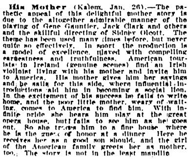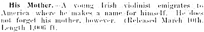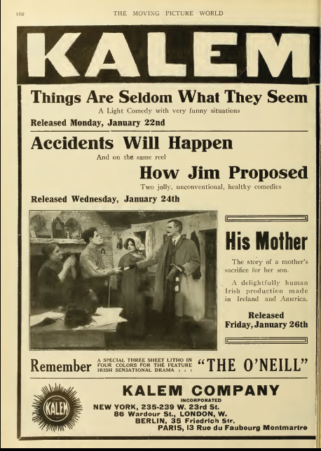 ![]() Pleine page de publicité parue dans The Moving Picture World, 13 janvier 1912, p. 102. Les huit films "irlandais" d'Olcott sont réunis dans un DVD dont His Mother. |