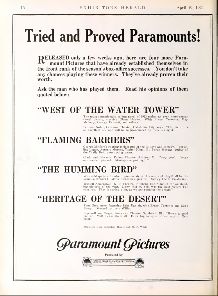 Pleine page de publicité parue dans Exhibitors Herald, 19 avril 1924