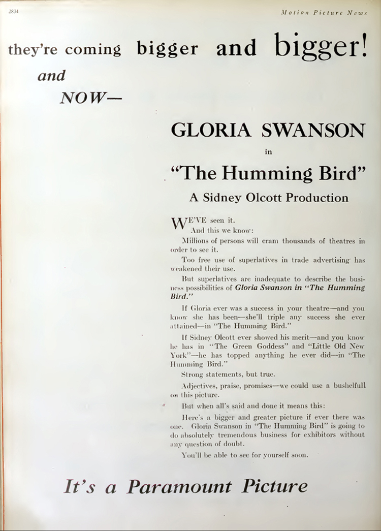 Pleine page de publicité parue dans Motion Picture Classic, février 1924, p 72. |