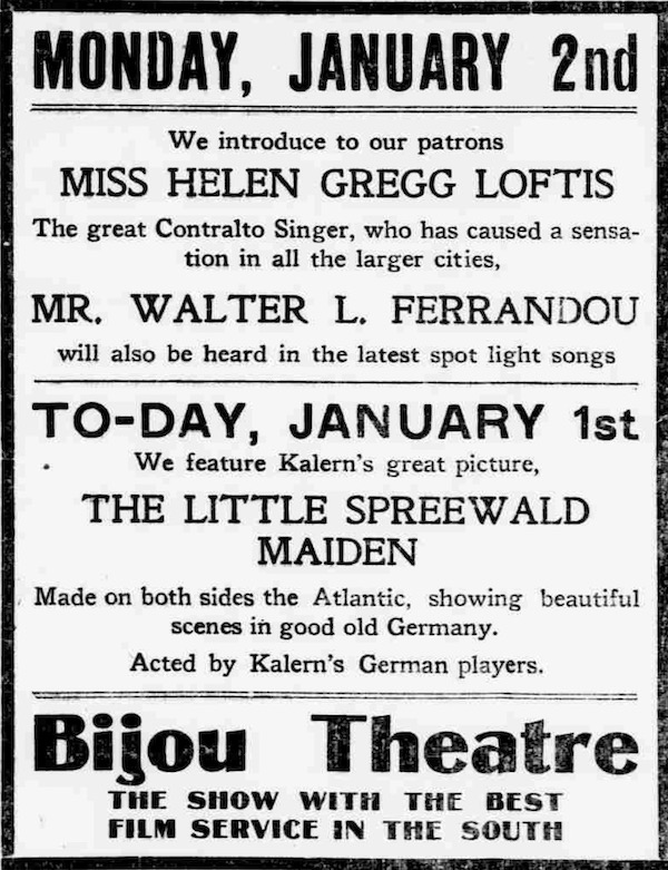 ![]() Les habitants ont joué volontiers les figurants. ![]() Petite publicité parue dans The Penascola Journal, le 1 janvier 1911, p. 7. |