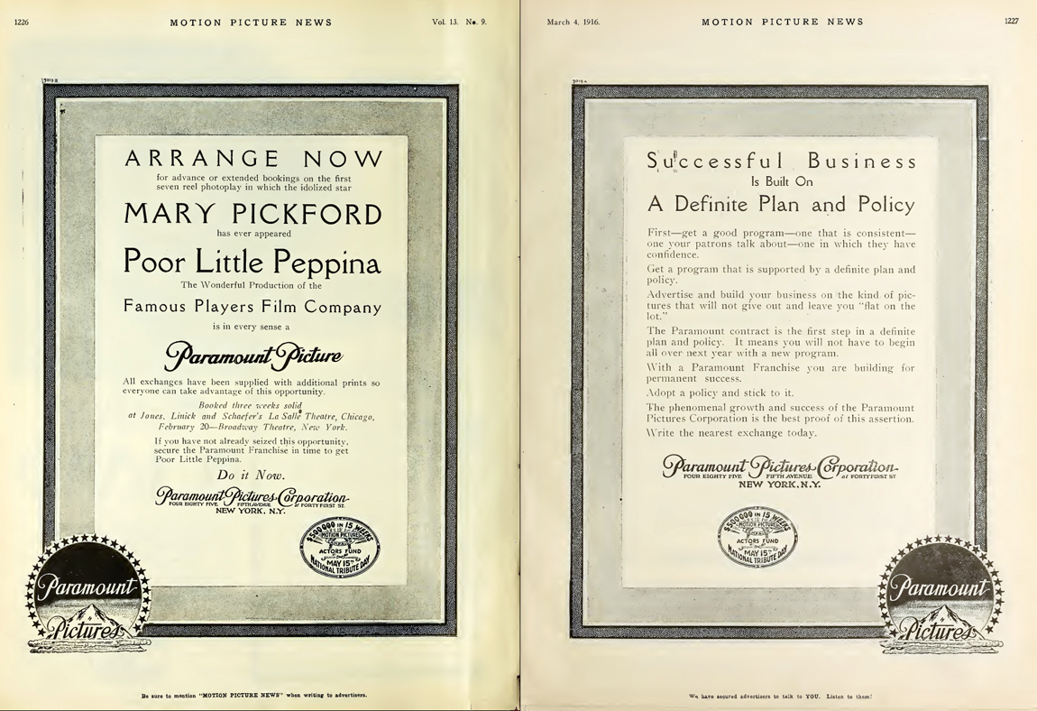 La presse Double page de publicité parue dans Motion Picture News, Vol 13 n° 9, 4 mars 1916, pp 1226-1227