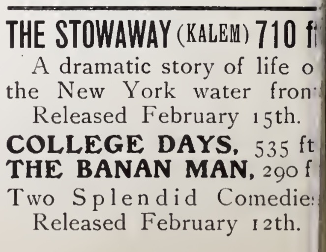 ![]() Petite publicité parue dans Views & Film Index, le 15 février 1908, pp. 8 et 10, et le 22 février 1908, p. 11. |