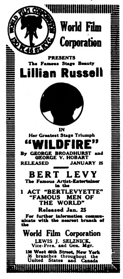 ![]() Petite publicité parue dans Variety, 16 janvier 1915, p. 32. Quatre films "Famous Men of Today", est le quatrième épisode d'une serie de quatre appelée "Bertlevyette" : "Great Americans, Past and Present", "Famous Rulers of the World" et "New York and Its People" Un procès pour finir En 1918, Bert Levy et Sidney Olcott intentent un procès à World Film parce que la maison de production ne leur a pas renvoyé les négatifs des "Bertlevyette" comme elle s'était engagée à le faire. Le quotiden professionnel The Film Daily consacre un long article à l'affaire. |