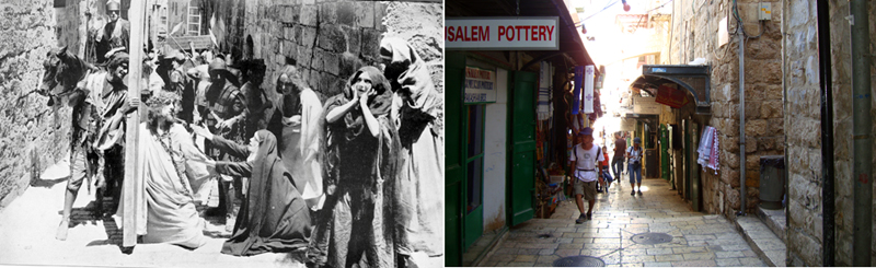 The Passion of the Christ occurs naturally on the Via Dolorosa. Among the most beautiful scenes of the film, the meeting of the victim with the Virgin Mary. It takes place on the Via Dolorosa, at number 12 , between 5th and 6th stations near the Mike Store, a gift shop , run by an Arab. Nearly a century later, the site is fully identifiable. Only change since, awnings adorn the shops.