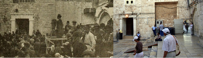 In Jerusalem, George Hollister Holy week filming for a documentary Easter Celebration at Jerusalem. He set up his camera on a platform in front of the entrance to the Church of the Holy Sepulchre. The place has hardly changed.