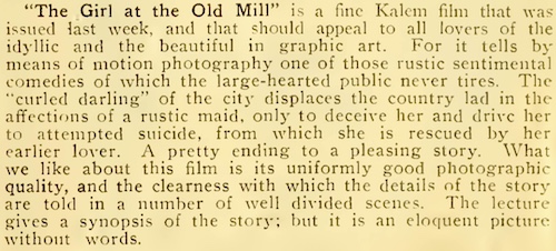 | La presse The Moving Picture World, 23 janvier 1909, p. 93 ![]() The Moving Picture World, 30 janvier 1909, p. 120 ![]() The New York Dramatic Mirror, 30 janvier 1909, p. 9 ![]() |