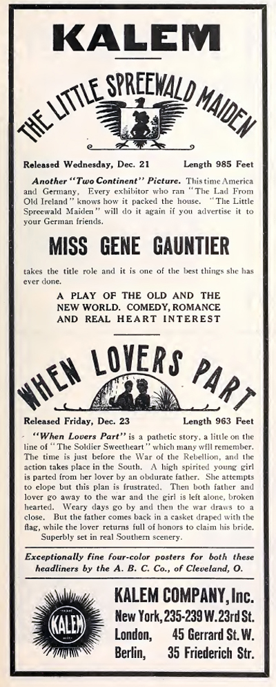 Publicité parue dans The Film Index, 17 décembre 1910, p. 21. |