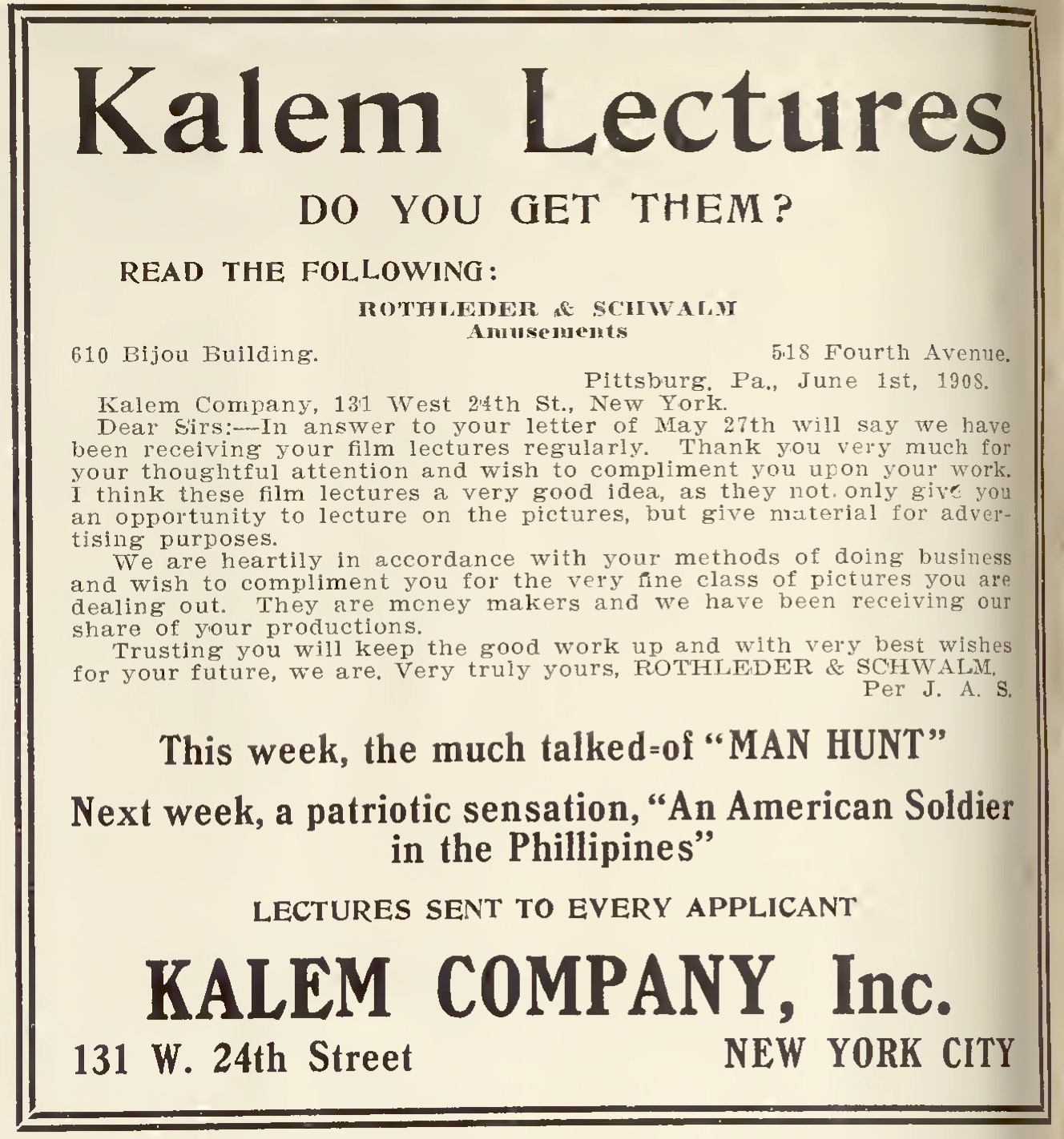 ![]() Publicité parue dans The Show World, le 13 juin 1908, p. 12. |